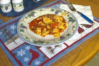 The pork I used for my recipe was boneless pork in the form of long, large strips of meat with very little fat. This is the 'New Pork' that is in the market today. There was so little fat on this pork that to brown it I had to saute it in a heavy fry pan with some butter to brown and sear the meat before I placed it in the baking dish with the sauce, and placed it in the oven to cook. With the Pork Chili I served my home made mashed potatoes that I mashed with low-fat sour cream and a pat of butter. With the chili and potatoes we had green beans with sauted mushroom slices, and sliced, browned almonds. A chunky apple sauce and slices of fresh pineapple completed the dinner.